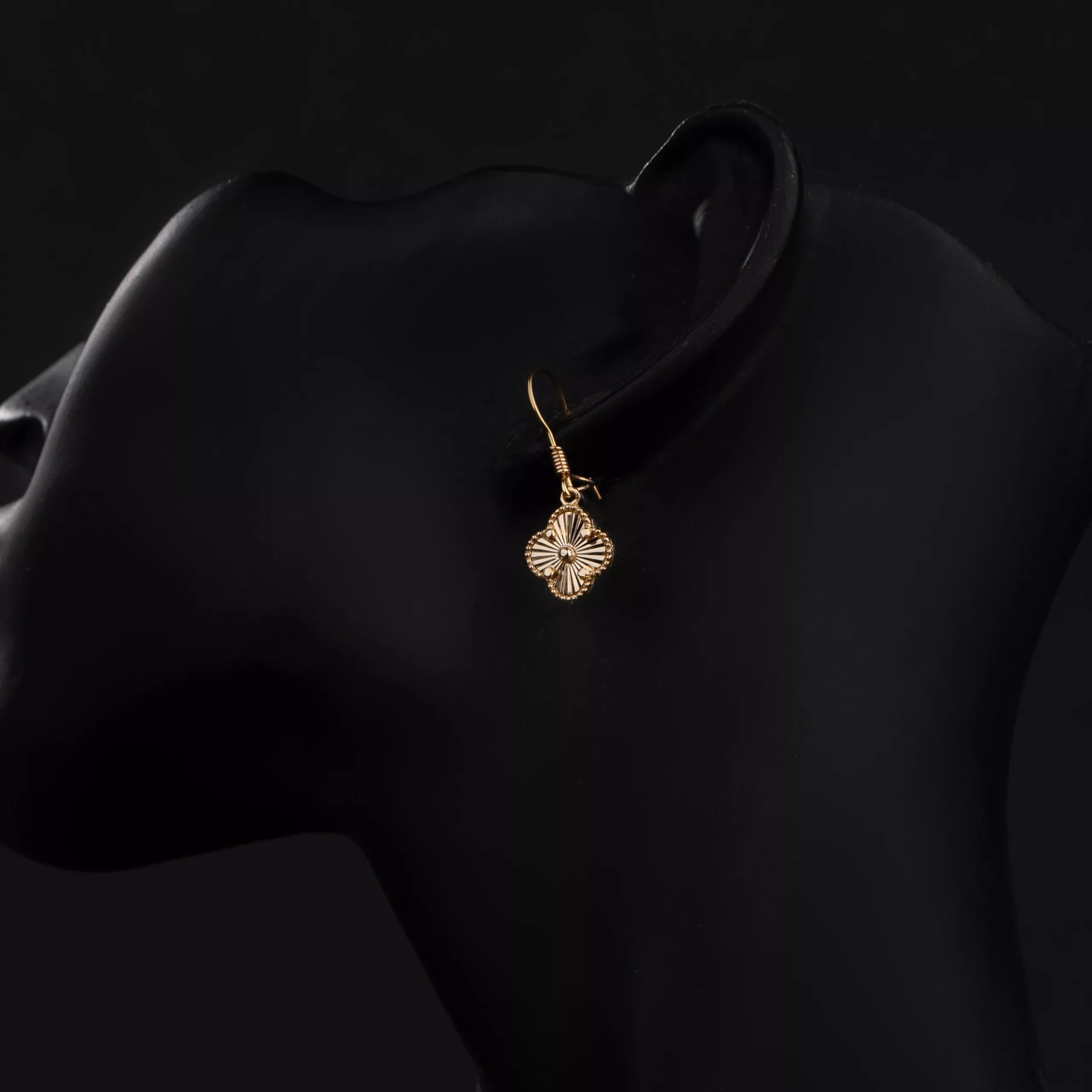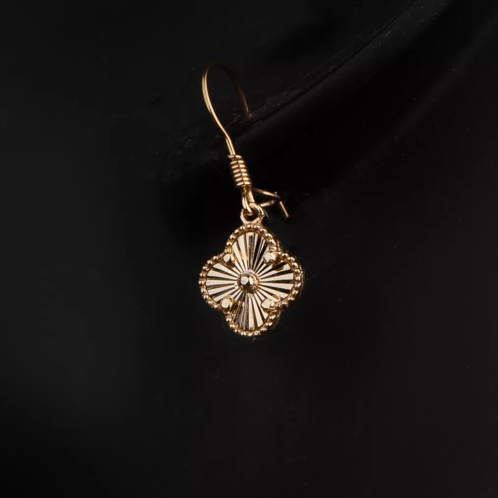 فرم عصایی این گوشواره باعث میشود گوش و صورت کشیدهتر و ظریفتر دیده شود. آویز بلند در کنار طرح ونکلیف (شبدر یا گل چهارپر) جلوهای بسیار شیک و مدرن ایجاد میکند.